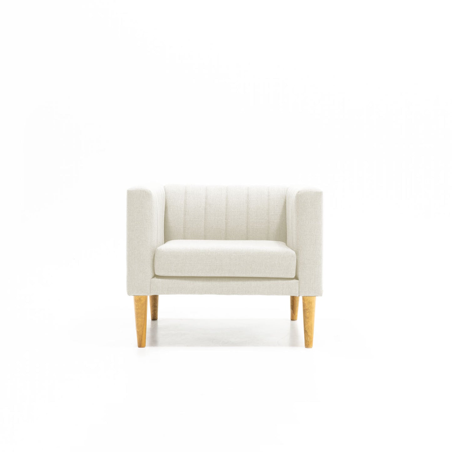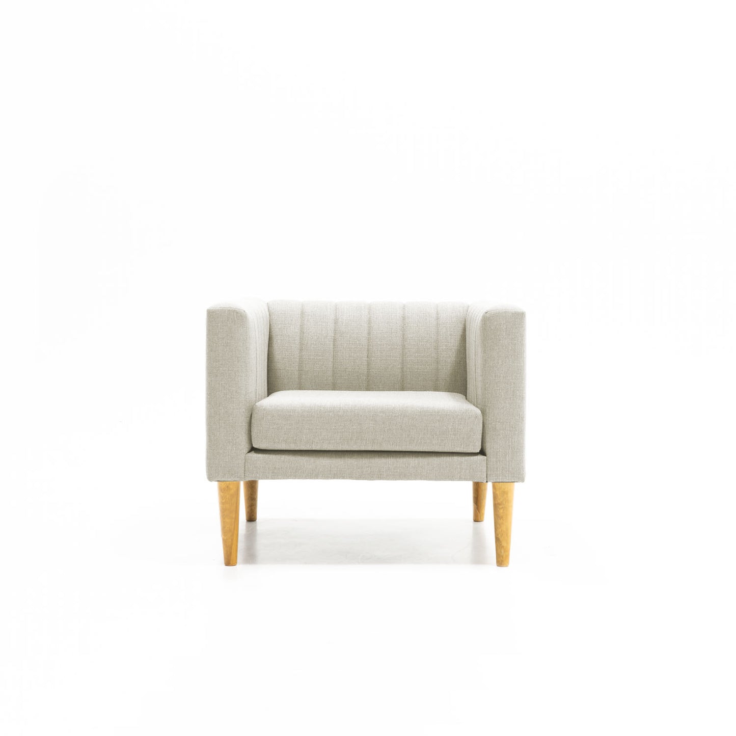Sofá de una, dos o tres plazas con brazos. Asiento y respaldo adheridos y/o cojines sujetos. Respaldo tapizado con rayas verticales. Sobre patas de madera de pino acabado a elegir. Tapiz a elegir.